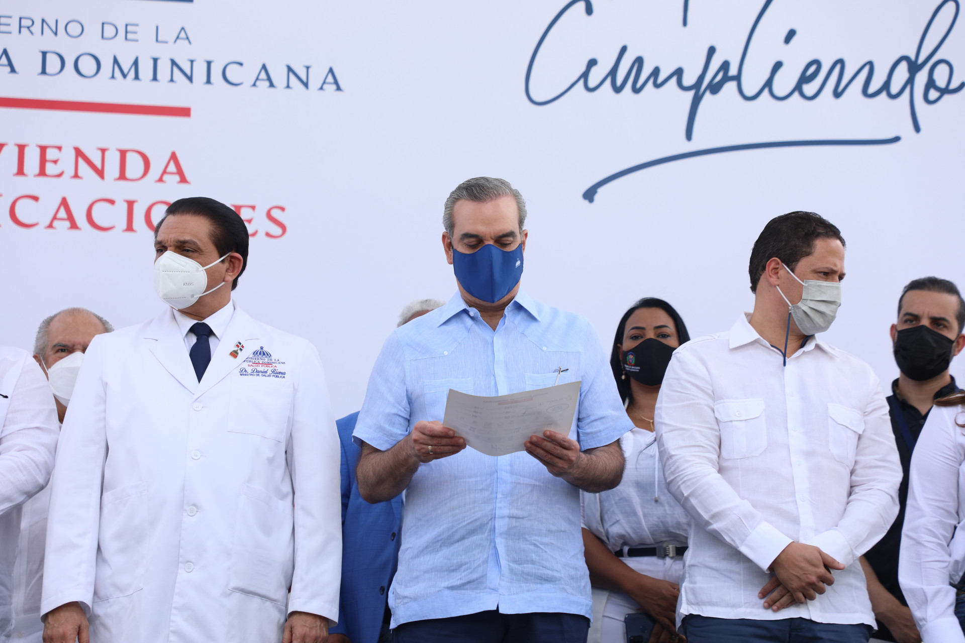 Acompañaron al presidente Luis Abinader, el ministro de la Presidencia, Lisandro Macarrulla, y el de Salud, Daniel Rivera; el director del Servicio Nacional de Salud, Mario Lama; el senador de la provincia San Pedro de Macorís, Franklin Peña, y Nelson Arroyo, presidente del consejo directivo del INDOTEL.
