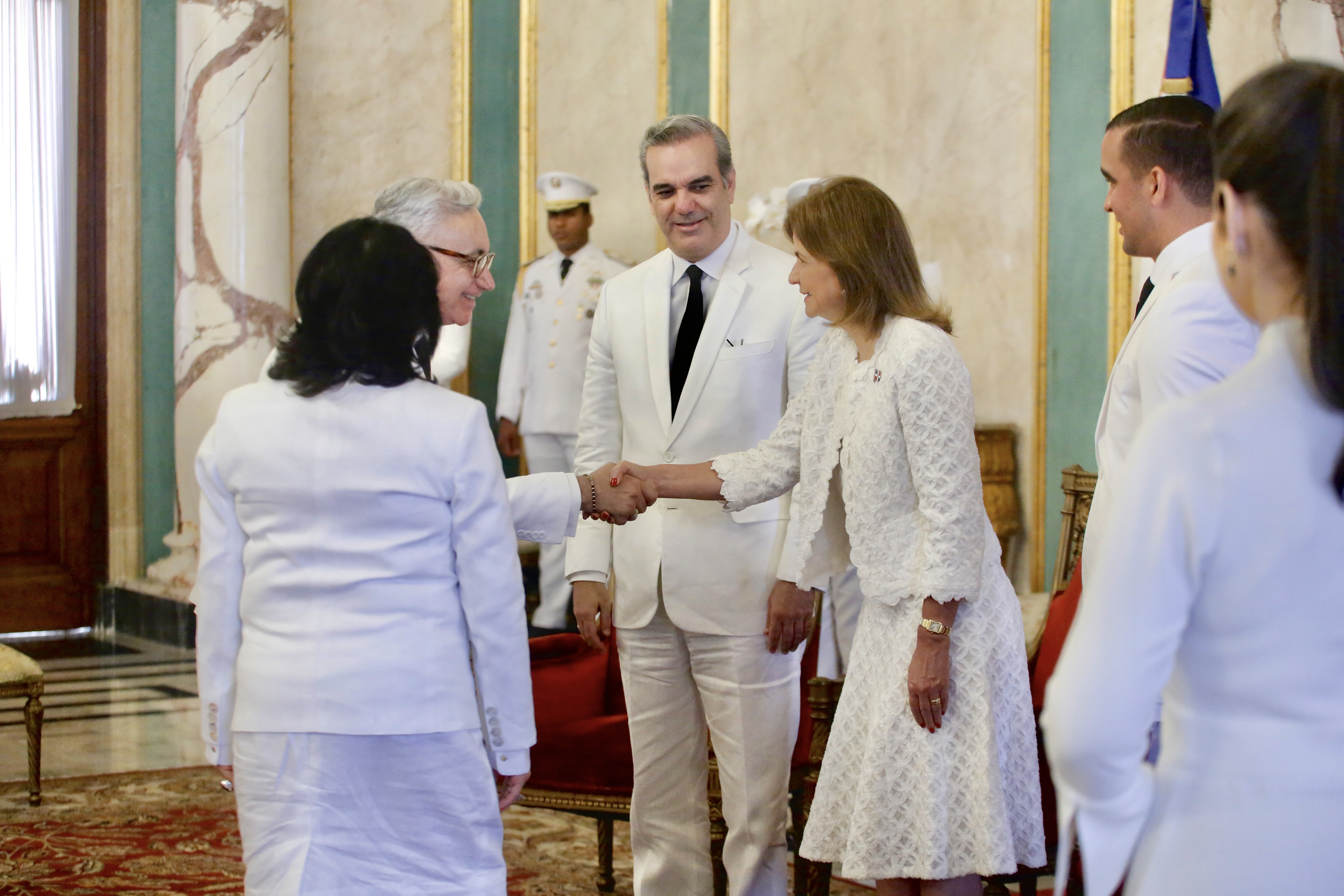 El acto protocolar se efectuó en el Salón de Embajadores del Palacio Nacional, donde el jefe de Estado estuvo acompañado de la vicepresidenta de la República, Raquel Peña, el viceministro de Relaciones Exteriores, José Julio Gómez.
