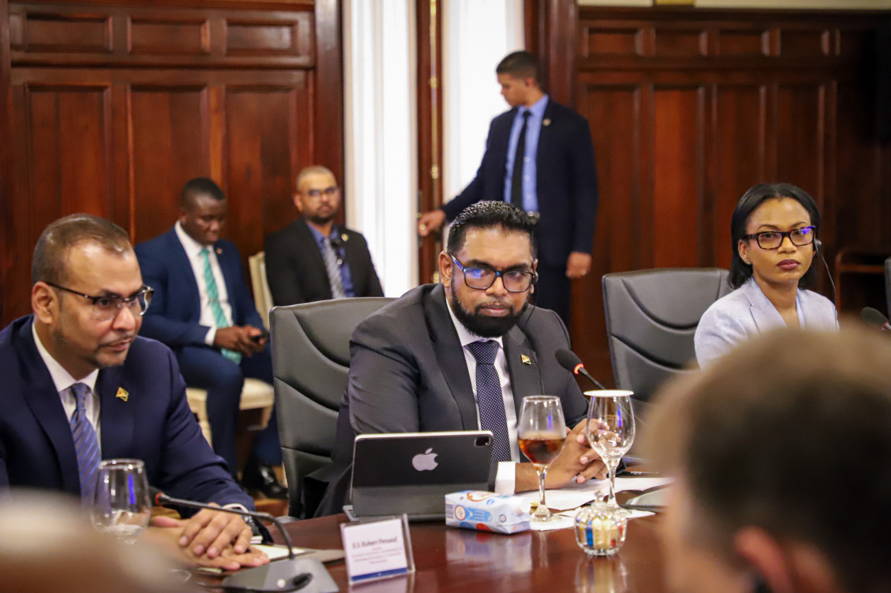 El presidente Luis Abinader junto con Mohamed Irfaan Ali, presidente de la República Cooperativa de Guyana 🇬🇾, encabezaron la reunión ampliada acompañados de las delegaciones de ambas naciones