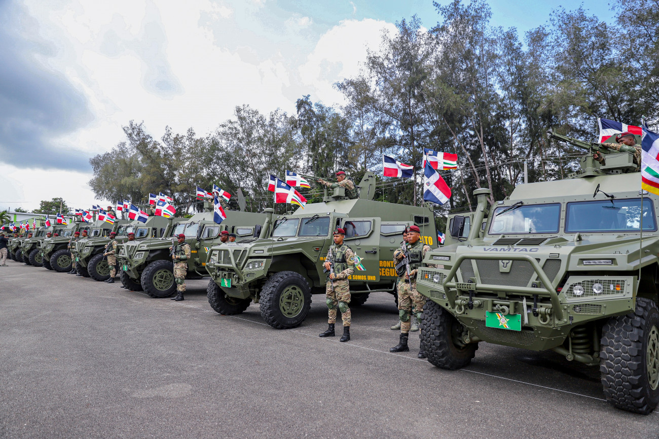 El presidente entrega 20 vehículos blindados de Alta Movilidad Táctico (VAMTAC), al ejército de la República Dominicana, que disponen de cámaras de alta definición en tiempo real y comunicación simultánea ante emergencias, los cuales fortalecerán este organismo militar, para proteger la integridad y soberanía de la nación.