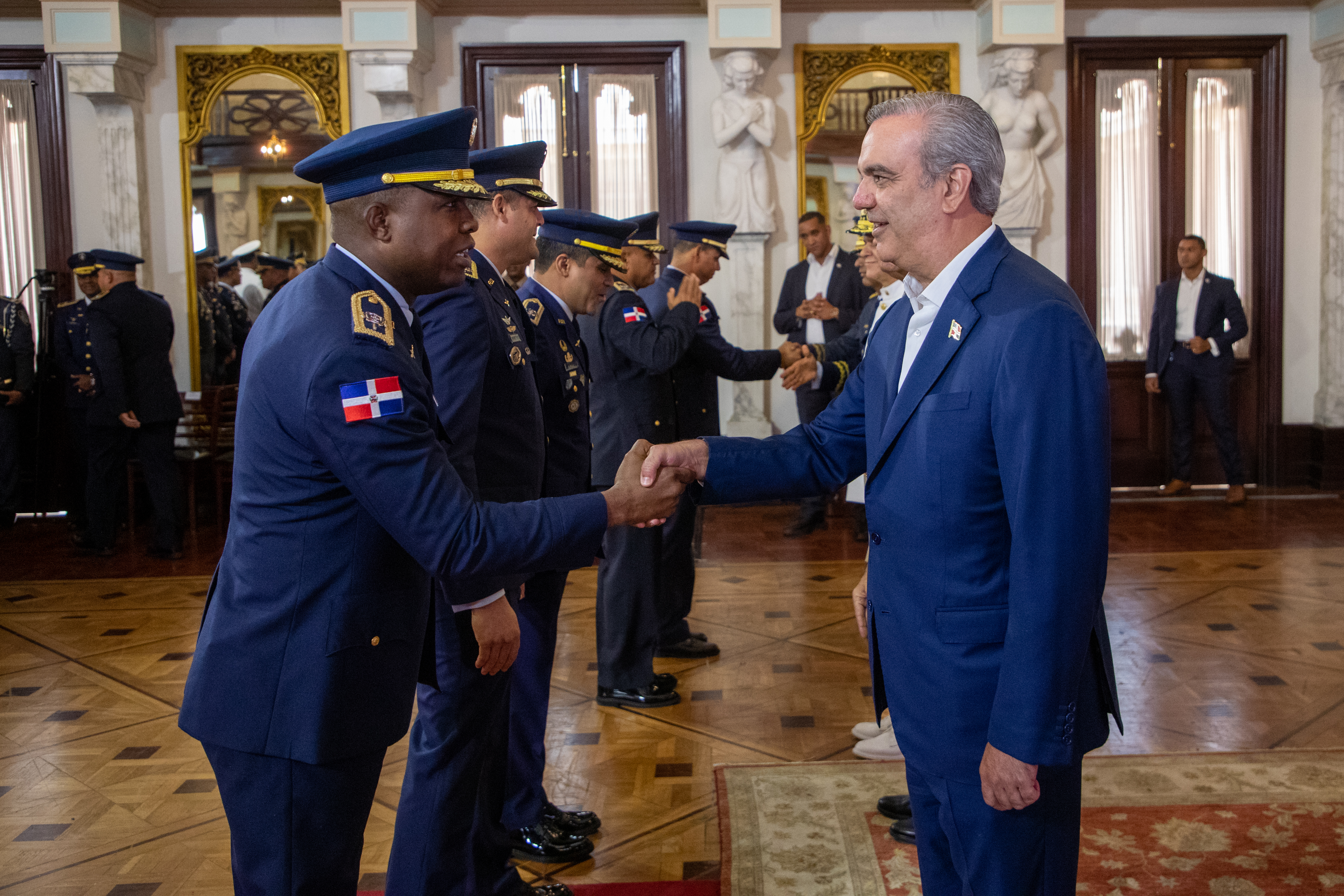 En un solemne acto, el Pdte. @LuisAbinader recibió el saludo de nueve promociones de oficiales de las Fuerzas Armadas y la Policía Nacional, a quienes manifestó su admiración, respeto y orgullo; asimismo, les reiteró su compromiso de seguir trabajando para mejorar sus condiciones laborales y de vida.