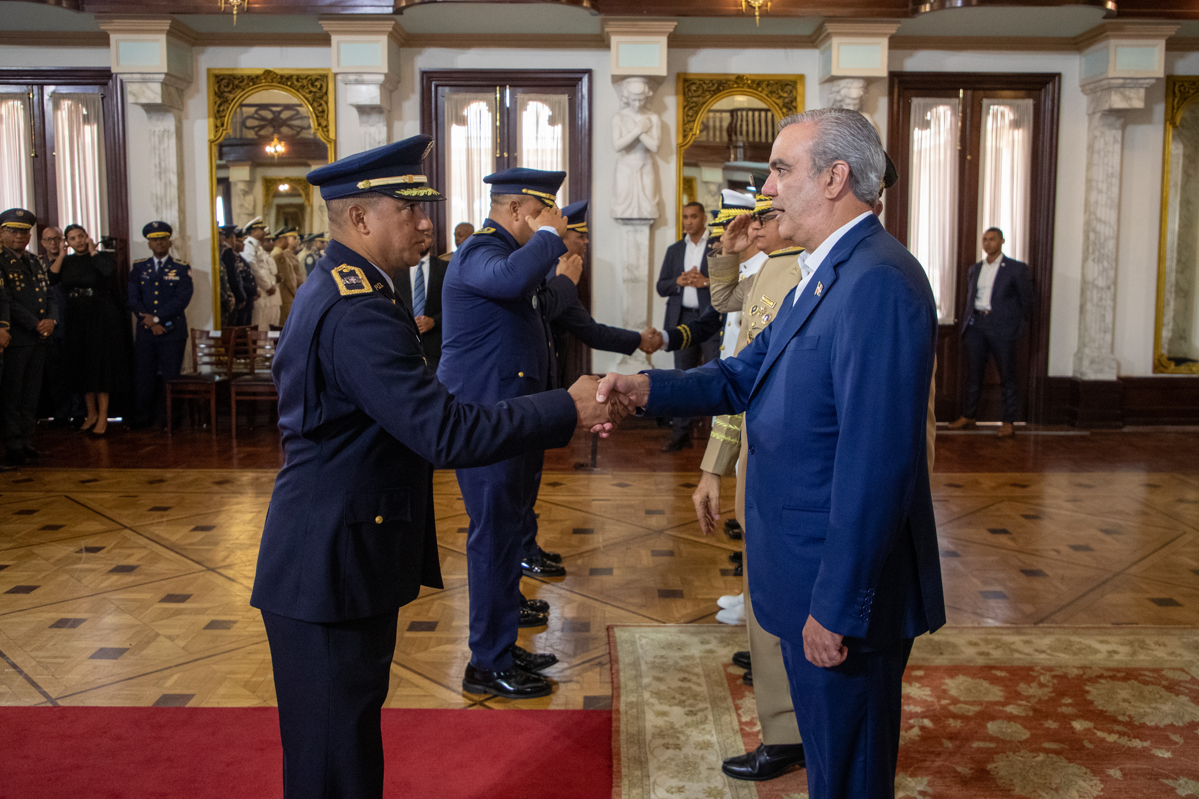 En un solemne acto, el Pdte. @LuisAbinader recibió el saludo de nueve promociones de oficiales de las Fuerzas Armadas y la Policía Nacional, a quienes manifestó su admiración, respeto y orgullo; asimismo, les reiteró su compromiso de seguir trabajando para mejorar sus condiciones laborales y de vida.