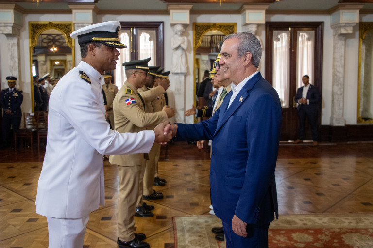 En un solemne acto, el Pdte. @LuisAbinader recibió el saludo de nueve promociones de oficiales de las Fuerzas Armadas y la Policía Nacional, a quienes manifestó su admiración, respeto y orgullo; asimismo, les reiteró su compromiso de seguir trabajando para mejorar sus condiciones laborales y de vida.