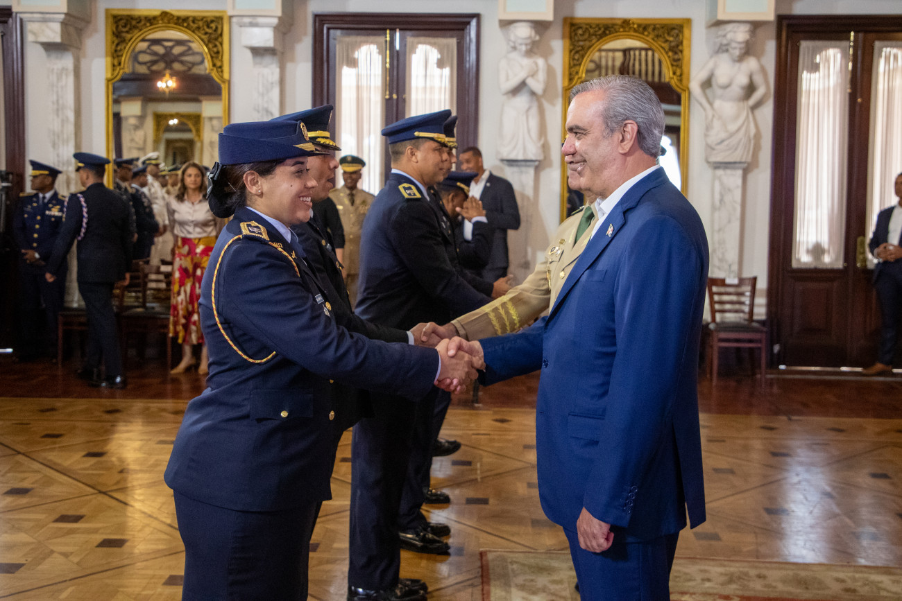 En un solemne acto, el Pdte. @LuisAbinader recibió el saludo de nueve promociones de oficiales de las Fuerzas Armadas y la Policía Nacional, a quienes manifestó su admiración, respeto y orgullo; asimismo, les reiteró su compromiso de seguir trabajando para mejorar sus condiciones laborales y de vida.