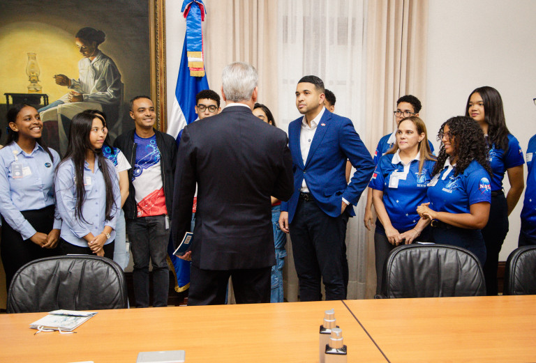 Santo Domingo.- El presidente Luis Abinader recibió en el Palacio Nacional a 12 estudiantes de los niveles universitario y secundario que participan en el concurso anual NASA Human Exploration Rover Challenge, organizado por la Administración Nacional de Aeronáutica y el Espacio (NASA).