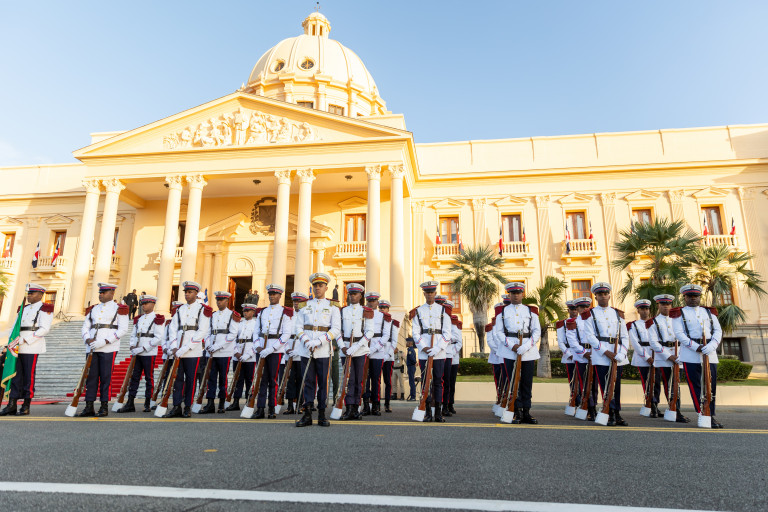 Luego, se llevó a cabo la rendición de honores militares de estilo al presidente Abinader, autoridad suprema de las Fuerzas Armadas y la Policía Nacional, que consistieron en toque de atención presidencial, presenten armas, una salva de 21 disparos de artillería y la entonación del himno nacional a cargo del Primer Regimiento de la Guardia Presidencial.